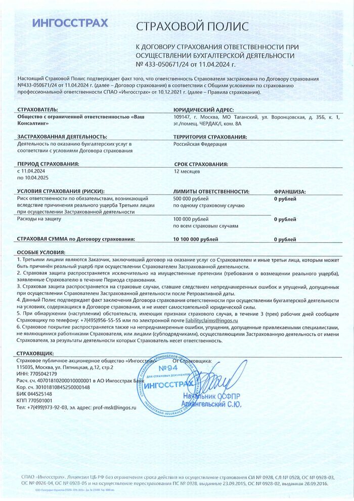 Застрахована на 10 млн. р. В случае ошибки по нашей вине мы сами оплатим все штрафы и пени.